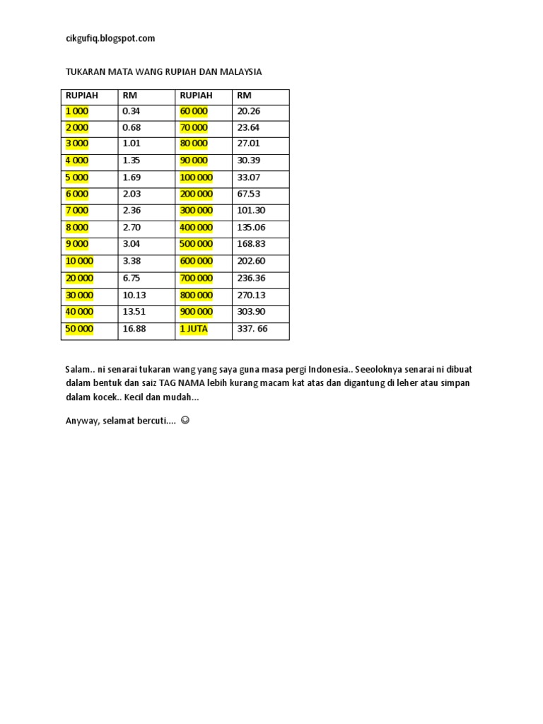 Sekurang-kurangnya 11 cuti umum yang gazet termasuk 5 hari cuti umum wajib. Laman web ini diterjemahkan daripada bahasa. 16 rows Mencari kadar-kadar pertukaran terbaik antara Rupiah Indonesia dan Ringgit Malaysia.